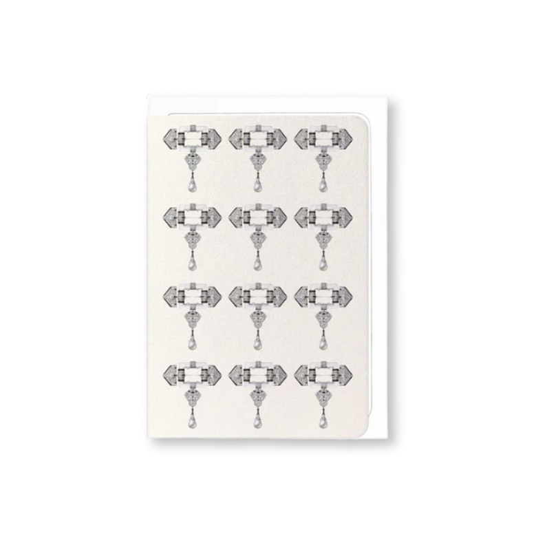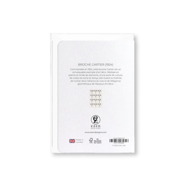 Découvrez ce Carte postal A6 Broche Cartier (1924). Commandée en 1924, cette broche Cartier est un remarquable exemple d'art déco. Réalisée en platine et ornée de diamants, d'une perle de culture, de cristal de roche et d'onyx, elle illustre la maîtrise de Cartier dans l'alliance du luxe et de l'élégance géométrique de l'époque Art déco.