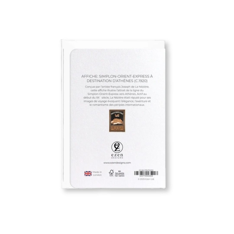 Découvrez ce Carte postal A6 Simplon-Orient-Express à destination d'Athènes. Conçue par l'artiste français Joseph de La Nézière, cette affiche illustre l'attrait de la ligne du Simplon-Orient-Express vers Athènes.