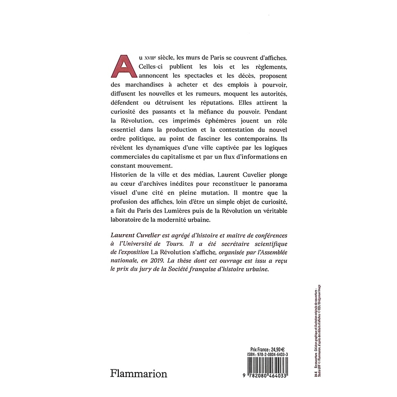 Au XVIIIe siècle, les murs de Paris se couvrent d'affiches. Celles-ci publient les lois et les règlements, annoncent les spectacles et les décès, proposent des marchandises à acheter et des emplois à pourvoir, diffusent les nouvelles et les rumeurs, moquent les autorités, défendent ou détruisent les réputations. Elles attirent la curiosité des passants et la méfiance du pouvoir. Pendant la Révolution, ces imprimés éphémères jouent un rôle essentiel dans la production et la contestation du nouvel ordre politique, au point de fasciner les contemporains. Ils révèlent les dynamiques d'une ville captivée par les logiques commerciales du capitalisme et par un flux d'informations en constant mouvement. Historien de la ville et des médias, Laurent Cuvelier plonge au coeur d'archives inédites pour reconstituer le panorama visuel d'une cité en pleine mutation. Il montre que la profusion des affiches, loin d'être un simple objet de curiosité, a fait du Paris des Lumières puis de la Révolution un véritable laboratoire de la modernité urbaine.